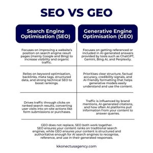 Unlike SEO which focuses on elevating a website’s position in search engine result pages (SERPs) GEO focuses on ensuring that large language models and AI search systems select your content as part of their generated answers. AI doesn’t just list links it synthesises information from multiple sources to deliver concise, conversational responses to user questions.